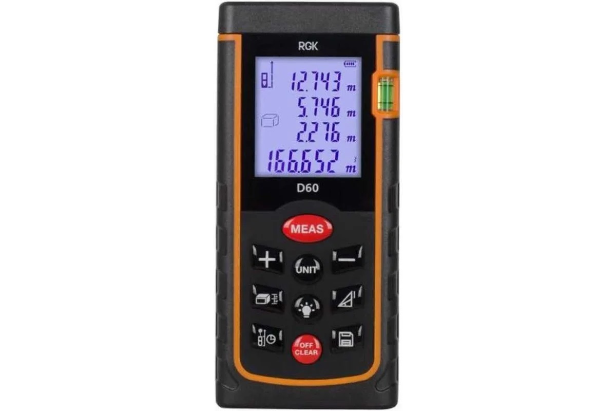 Лазерная рулетка RGK D60 служит для измерения расстояний до 60 метров. Она используется при ремонте и строительстве. Модель снабжена следующими функциями: сложение и вычитание, расчет площади, определение неизвестной высоты по Пифагору, непрерывное измерение, максимум/минимум, измерение заданной длины. Все измерения выводятся на четырехстрочный дисплей с подсветкой. Корпус прибора защищен от влаги и пыли по стандарту IP54.