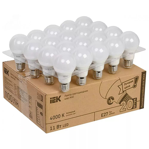 Лампы светодиодные IEK LLE-A60-11-230-40-E27-20 (A60 груша, Е27, 11 Вт, 1100 лм, 4000 К), упаковка 20 шт.