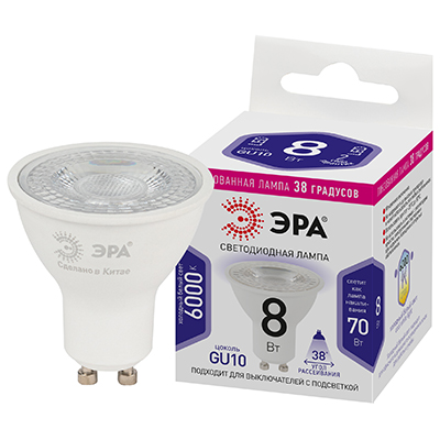 Лампа светодиодная "Эра" STD LED Lense MR16-8W-860-GU10 (софит, 220 В, 8 Вт, 650 лм, 6000 К, линза 38°), прозрачный