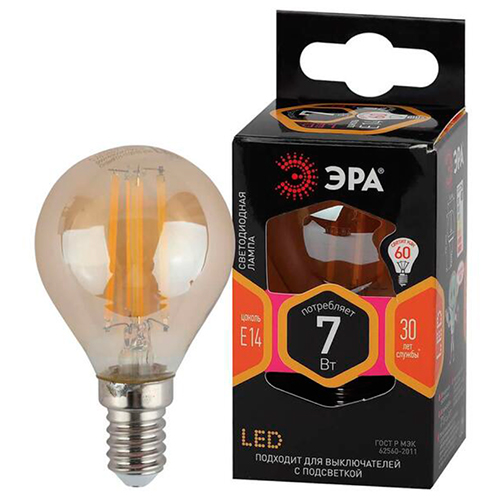 Лампа светодиодная F-LED P45-7W-827-E14 Gold "Эра" (шар, Е14, 7 Вт, 625 лм, 2700 К, золотистая колба)