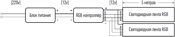 Три контакта светодиодной ленты - R, G и B, которые обычно промаркированы соответствующим цветом, подключаются к RGB-контроллеру с запасом по мощности 20%.