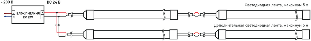 - Максимальная длина подключения ленты - 5 метров.