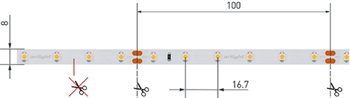 Ленту можно разрезать только в обозначенных местах по линии между контактными площадками для пайки.