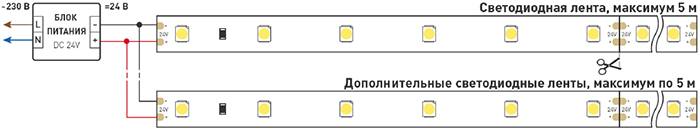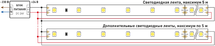 Схема подключения нескольких светодиодных лент с одной стороны: