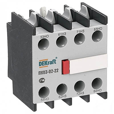 Приставка контактная DEKraft серии ПК-03 предназначена для увеличения количества вспомогательных контактов контактора КМ-103.