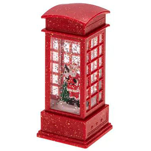Светильник с эффектом снегопада выполнен в форме телефонной будки, внутри которой находится фигурка Санта Клауса.