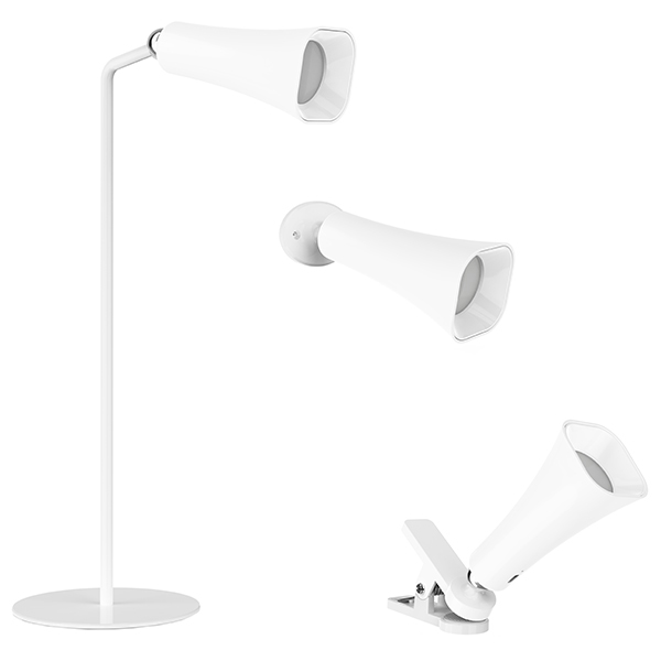на стол (на опору с подставкой), клипсой к поверхности, а также на стену при помощи клейкой платформы.