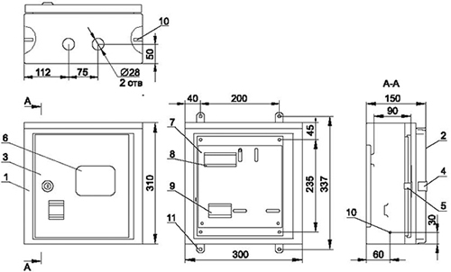 1 - корпус щита. 2 - дверь. 3 - дверь. 4 - замок. 5 - замок. 6 - стекло. 7 - панель монтажная. 8 - DIN-рейка ВН и ОПС. 9 - DIN-рейка ВА. 10 - шпилька заземления. 11 - зацеп крепежный. |