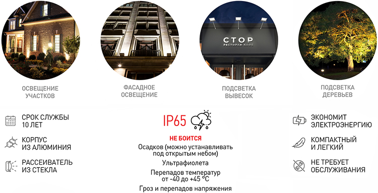 Позволяет обеспечить мощный световой поток для подсветки различных объектов и необходимое количество света для общего освещения.