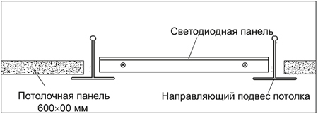 Светодиодную панель установить на место потолочной плиты 600 x 600 мм в межпотолочное пространство.